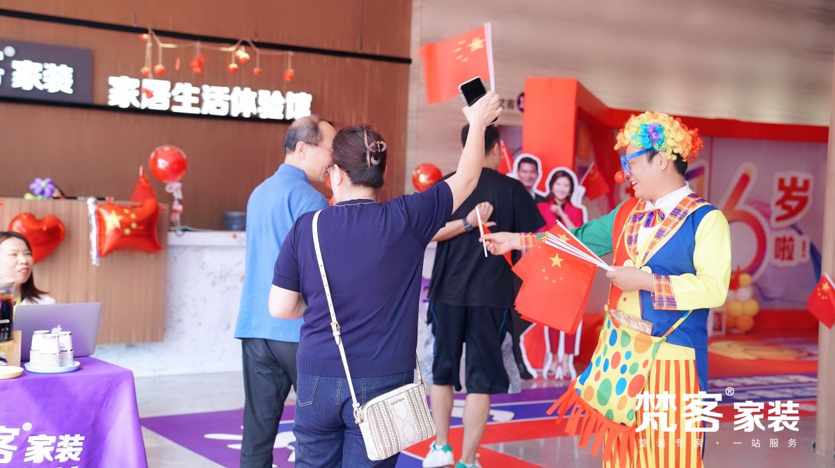 吉祥物手舉小紅旗,迎接業主朋友的到來。梵客家裝也為在國慶小長假簽約的業主朋友準備了鉅惠豪禮,不僅讓大家吃好喝好玩好,更要裝好房筑好家。