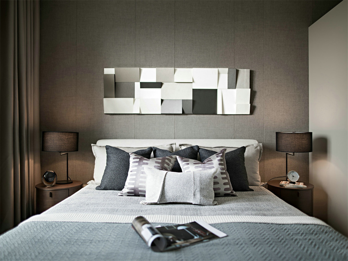 主臥的設(shè)計(jì)主要是圍繞著都市風(fēng)尚,整個(gè)空間凸顯品位與現(xiàn)代感,飾物的造型干凈利落,灰色調(diào)高貴雅致,深淺不一的抱枕增加了空間層次感。整個(gè)臥室都顯得柔軟舒適。